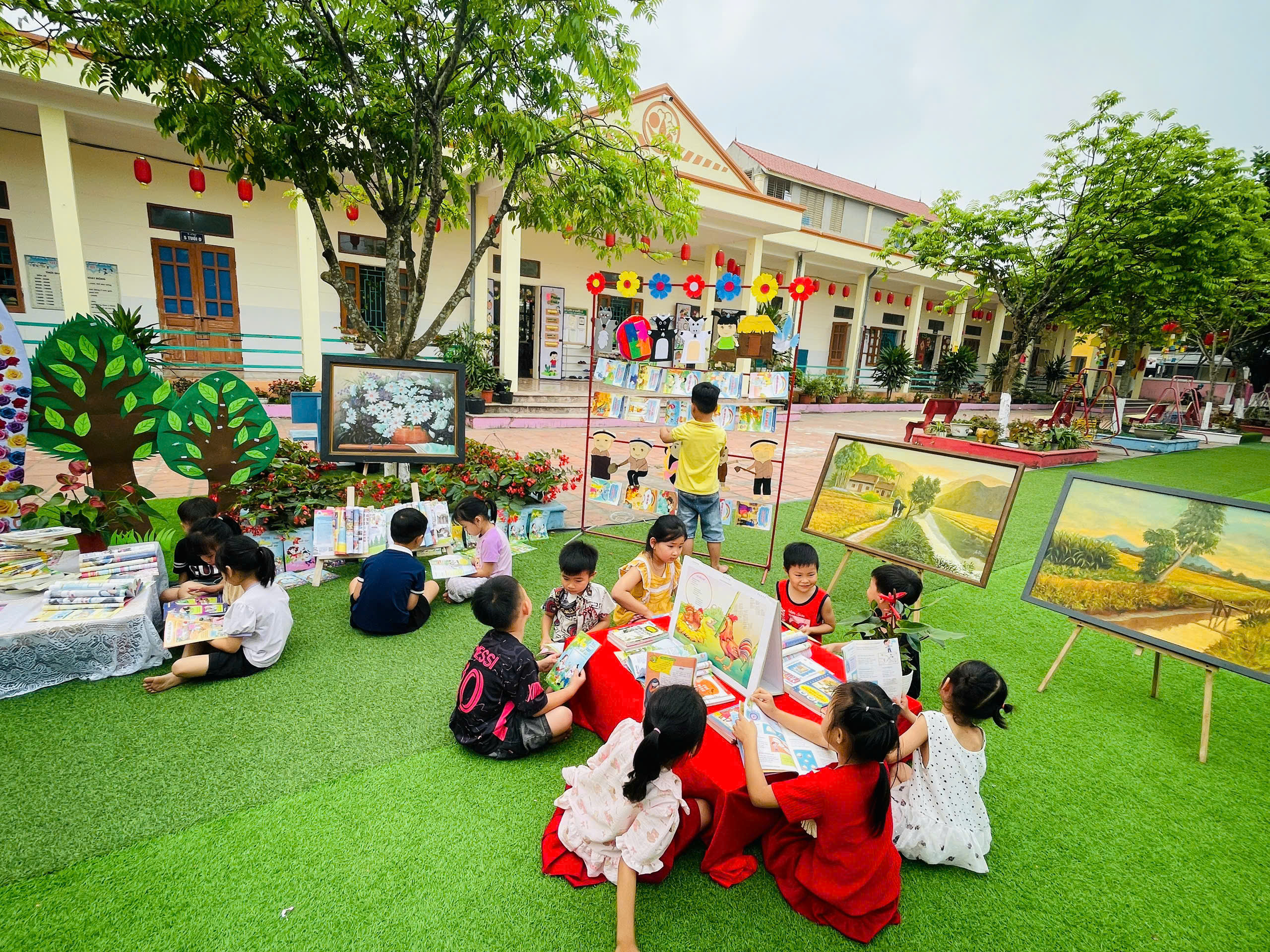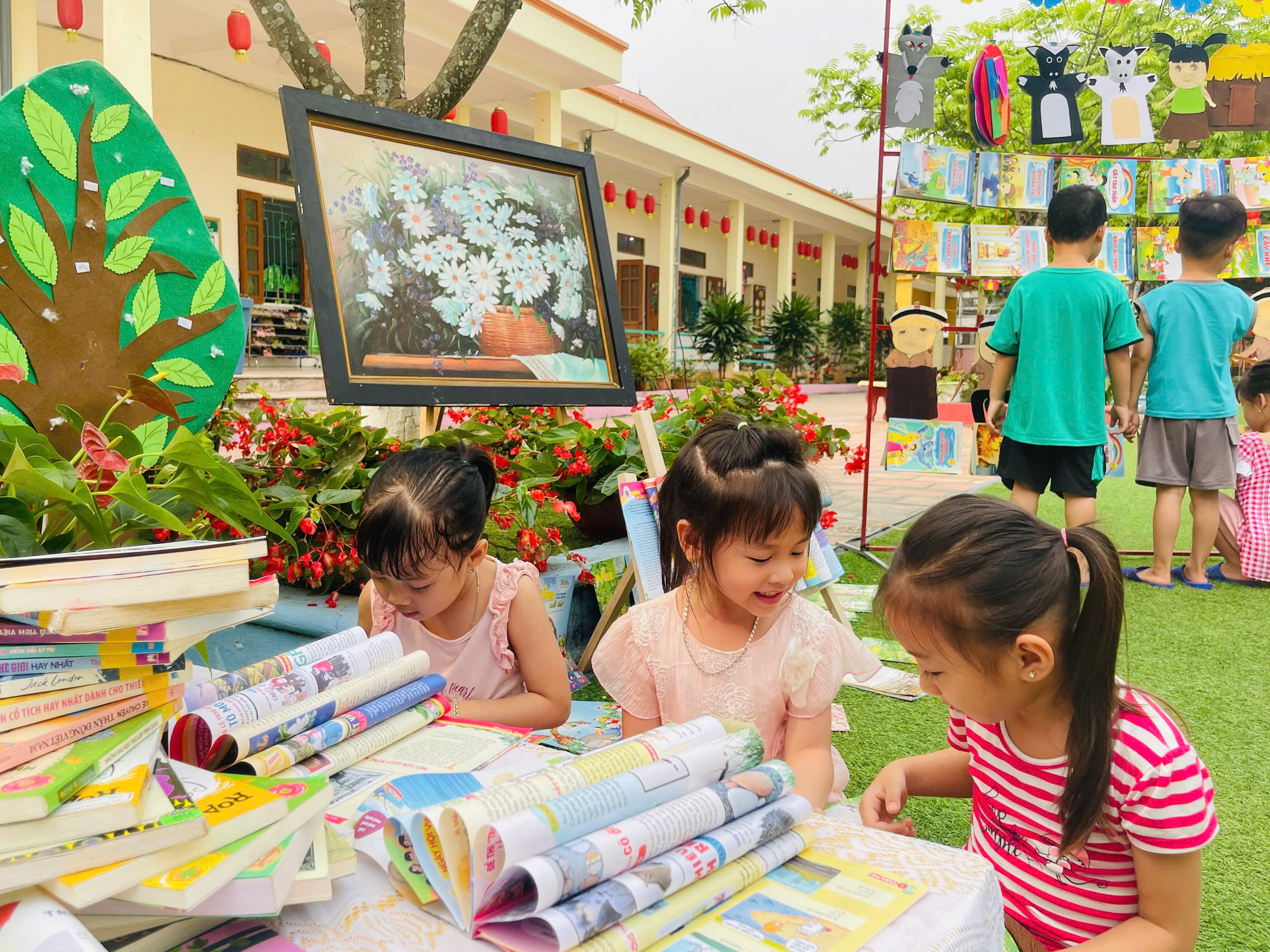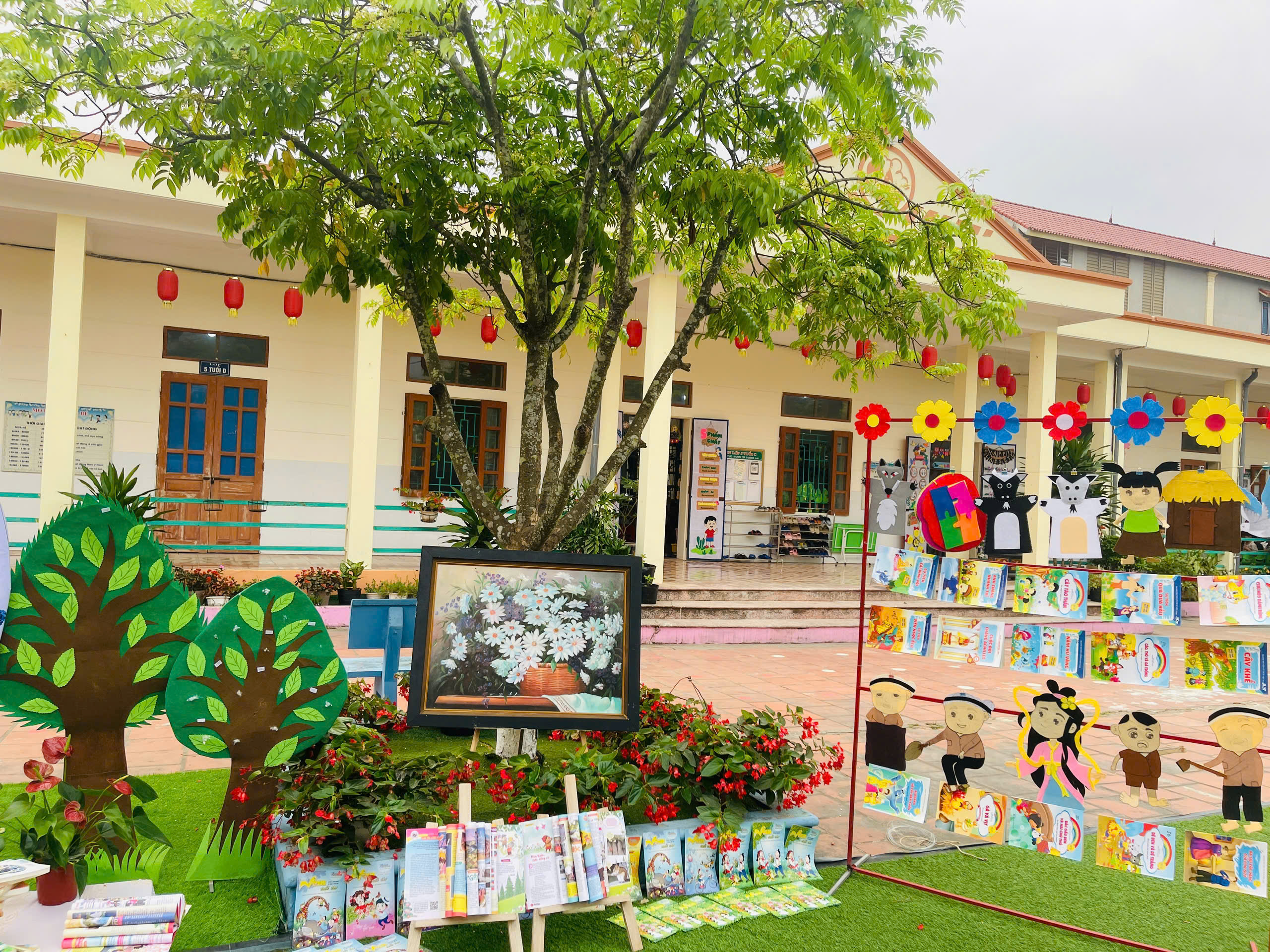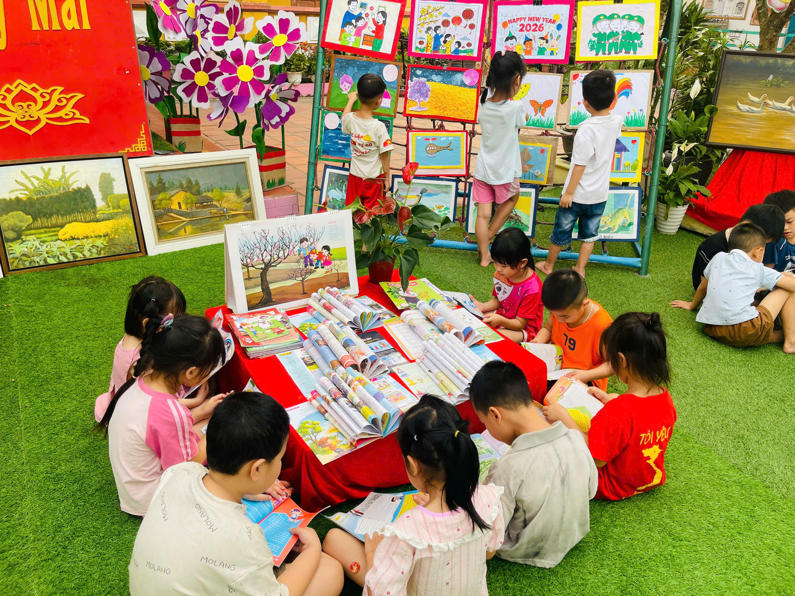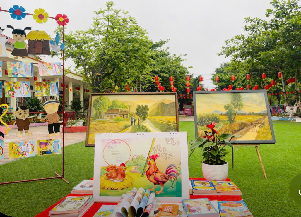 Những góc trưng bày được thiết kế sinh động với đa dạng các loại sách, truyện tranh phù hợp lứa tuổi mầm non. Đặc biệt, các sản phẩm do chính tay các bé và cô giáo cùng thực hiện đã tạo nên một không gian gần gũi, thân thiện và đầy sáng tạo.