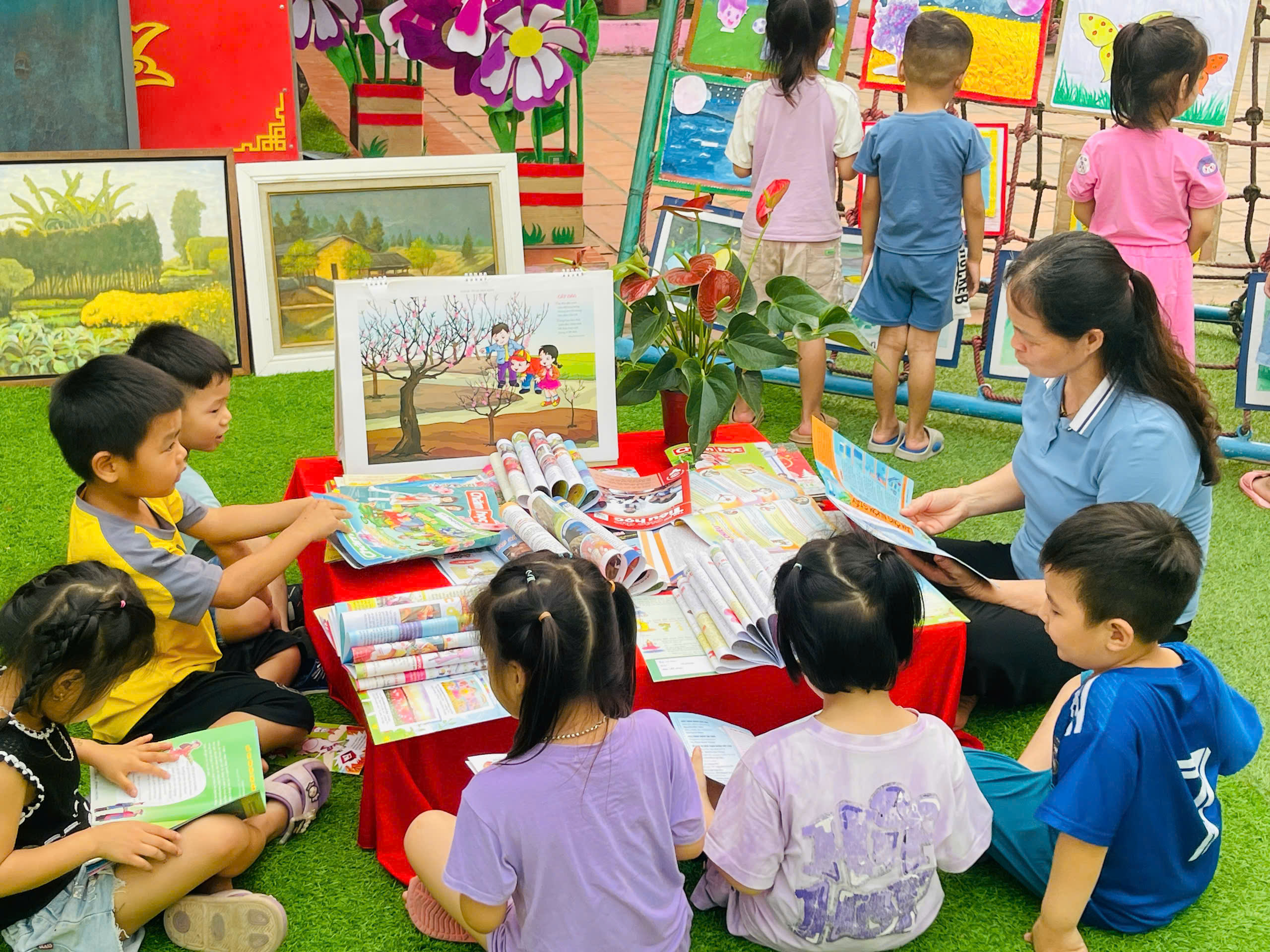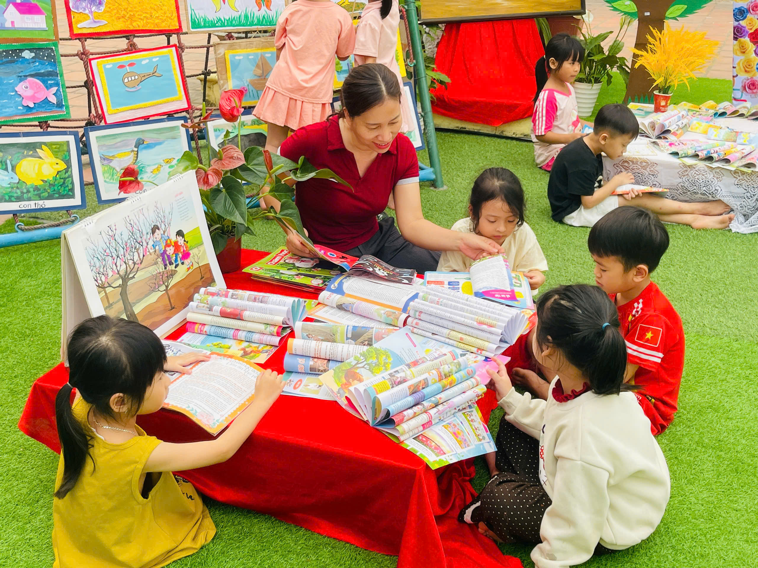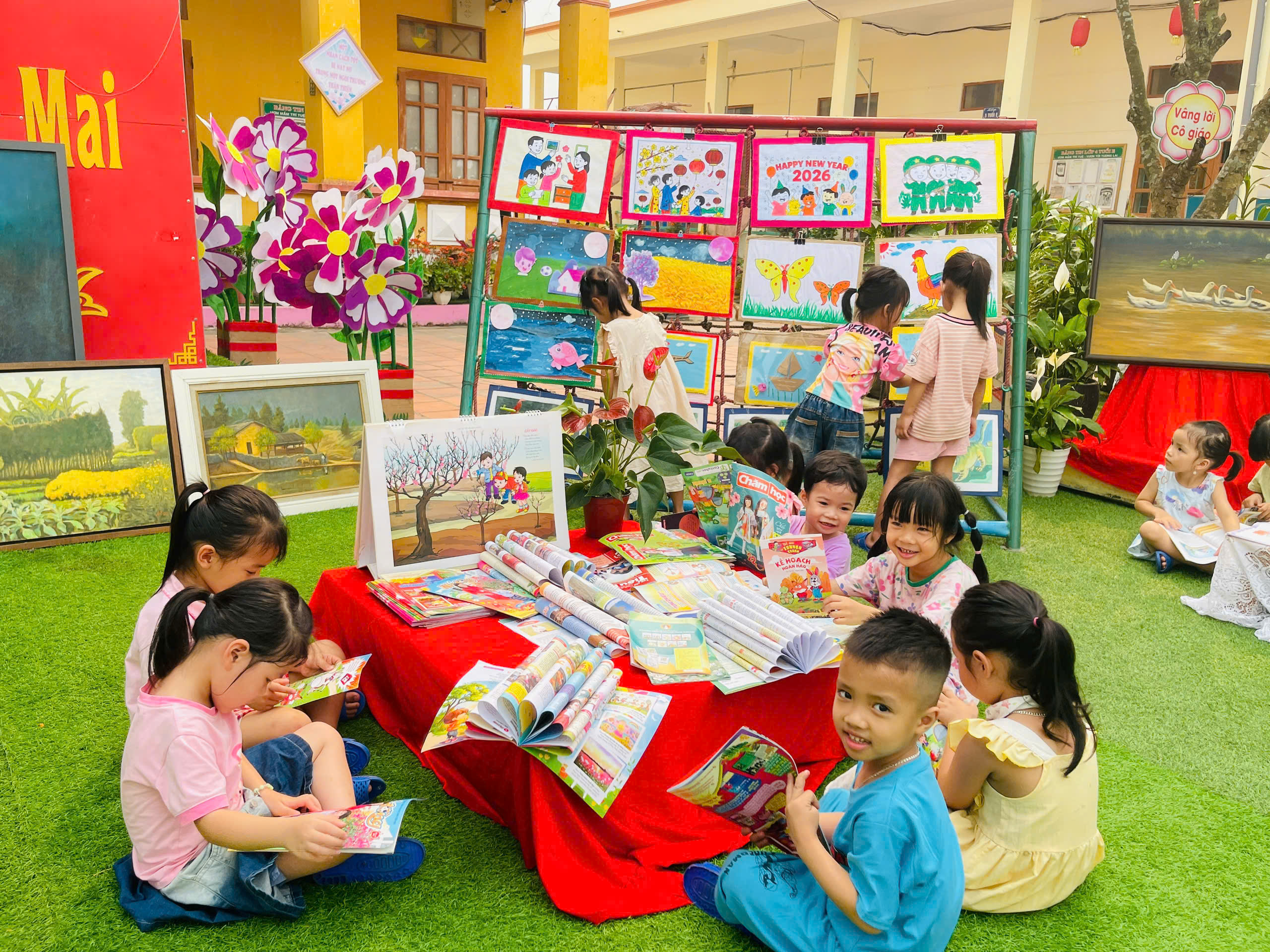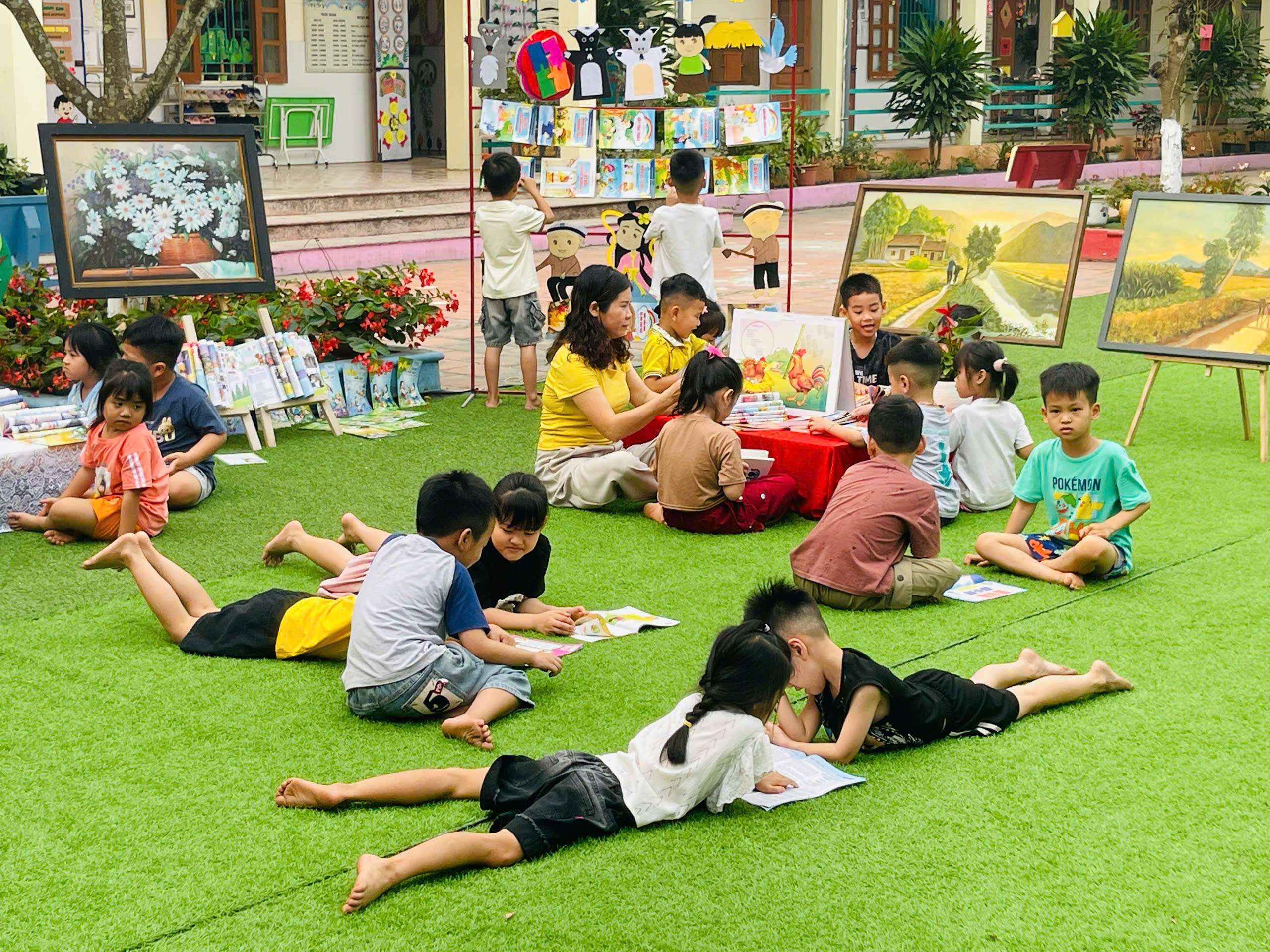 Những góc trưng bày được thiết kế sinh động với đa dạng các loại sách, truyện tranh phù hợp lứa tuổi mầm non. Đặc biệt, các sản phẩm do chính tay các bé và cô giáo cùng thực hiện đã tạo nên một không gian gần gũi, thân thiện và đầy sáng tạo.