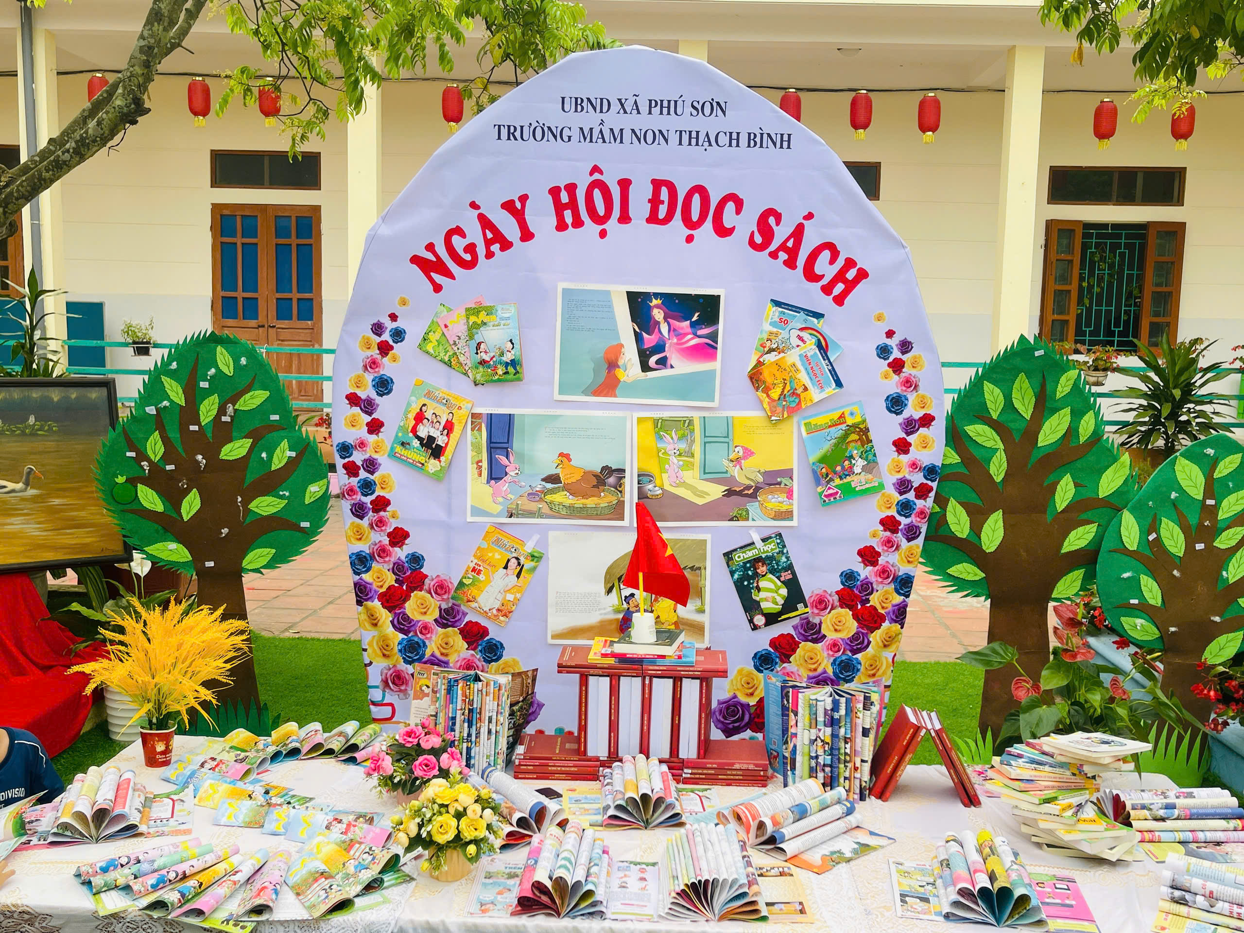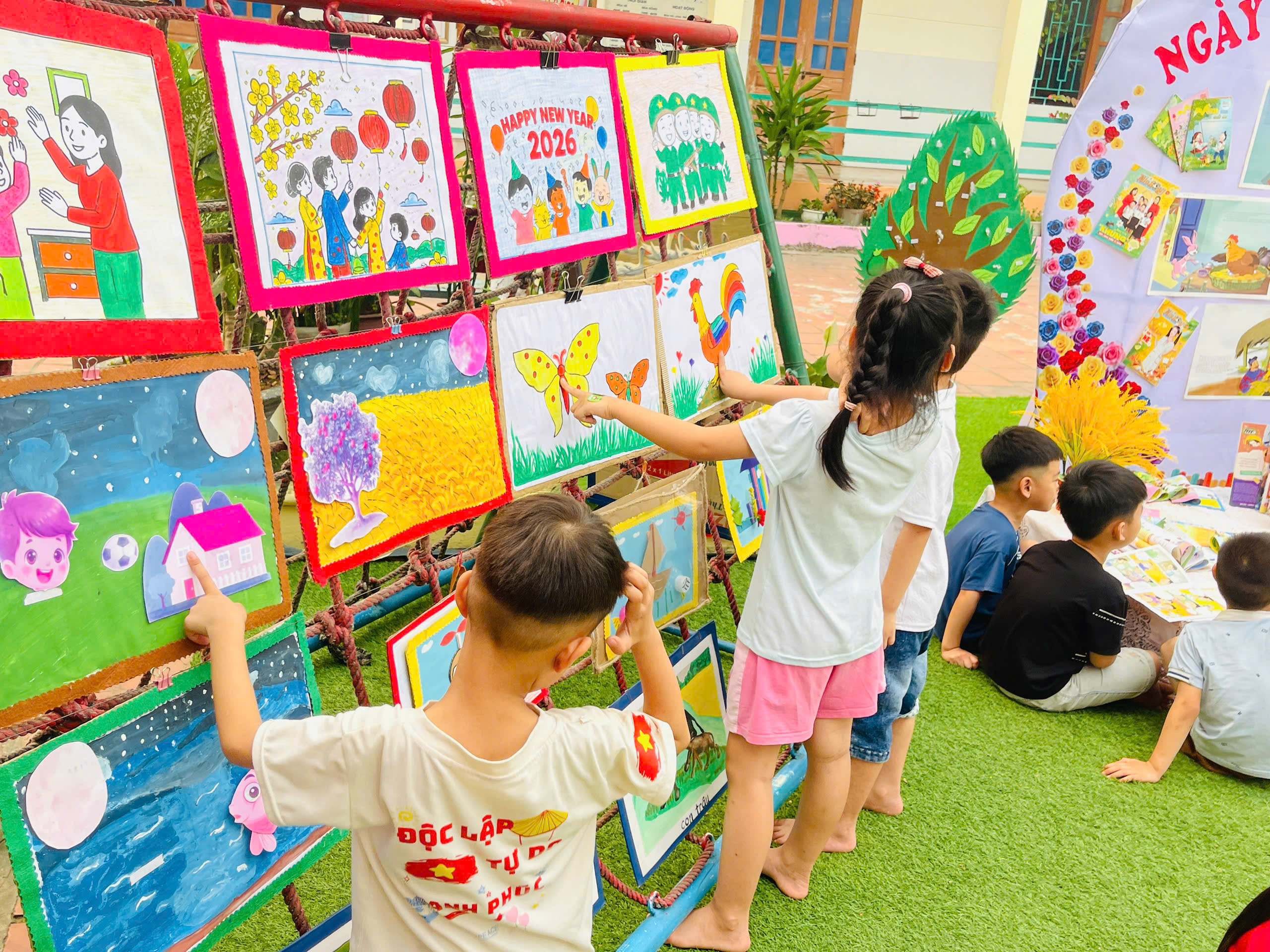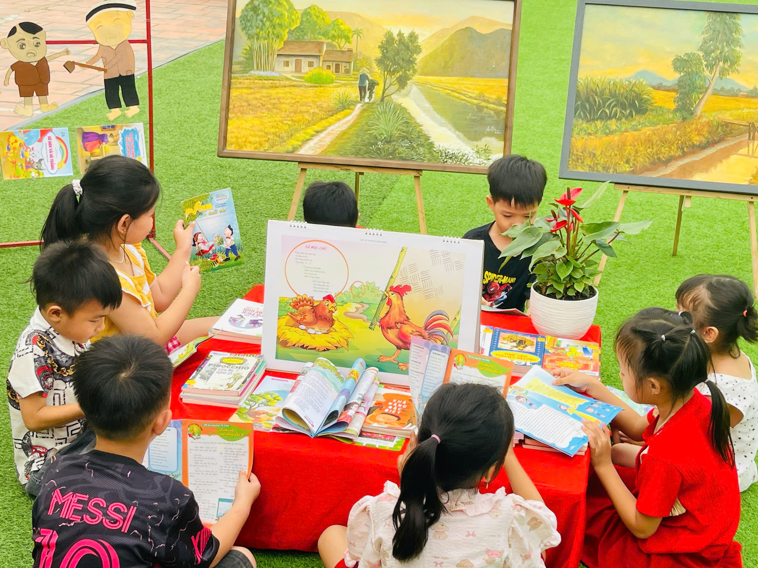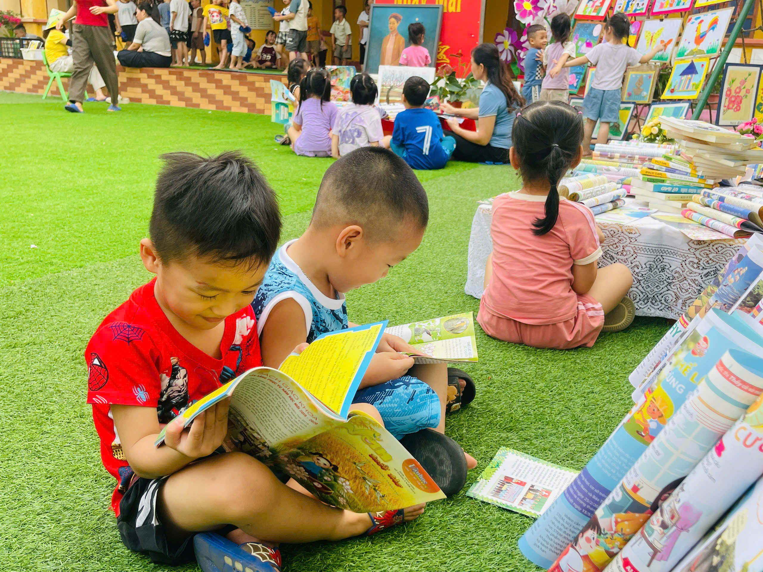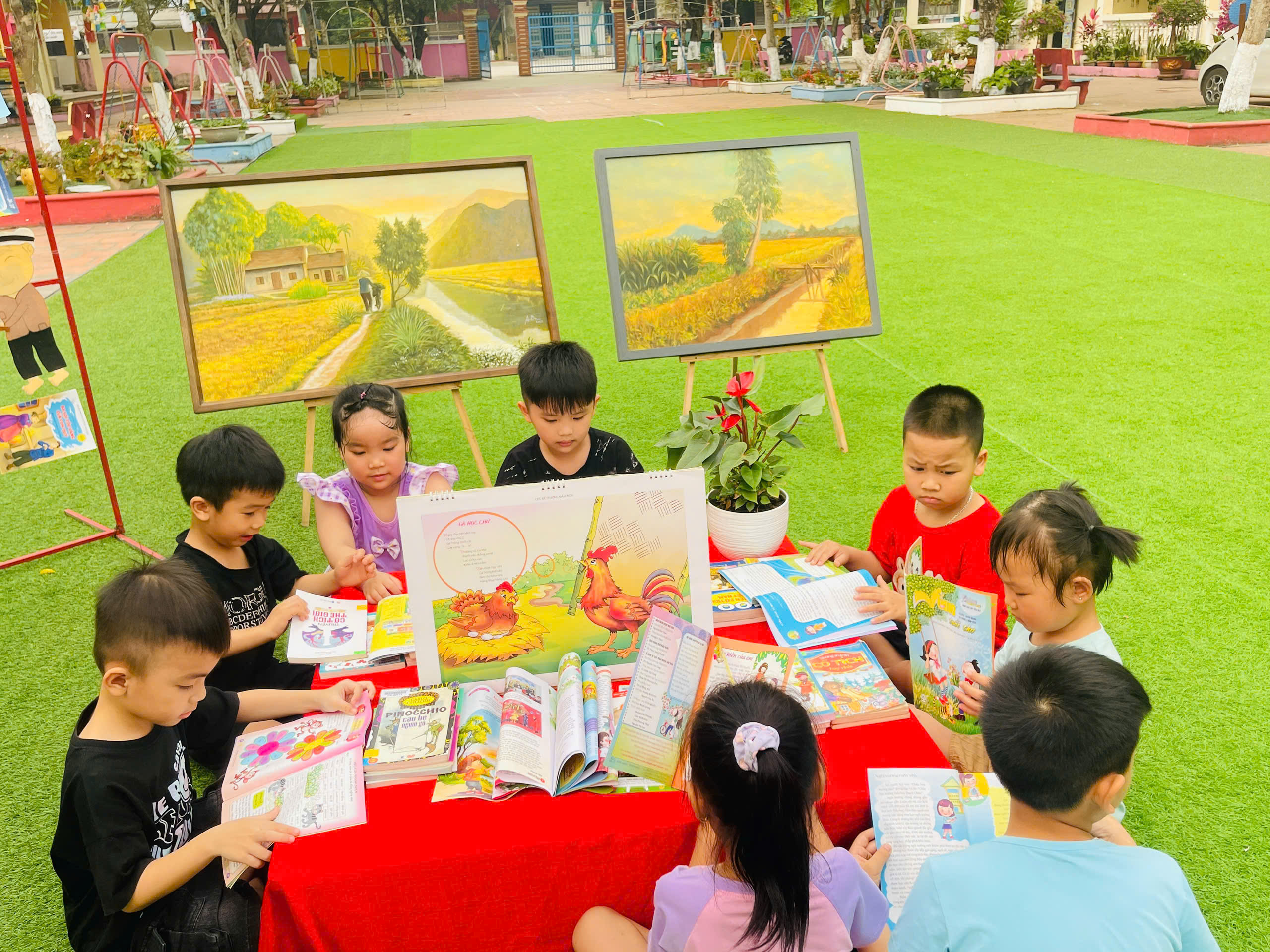 Những góc trưng bày được thiết kế sinh động với đa dạng các loại sách, truyện tranh phù hợp lứa tuổi mầm non. Đặc biệt, các sản phẩm do chính tay các bé và cô giáo cùng thực hiện đã tạo nên một không gian gần gũi, thân thiện và đầy sáng tạo.