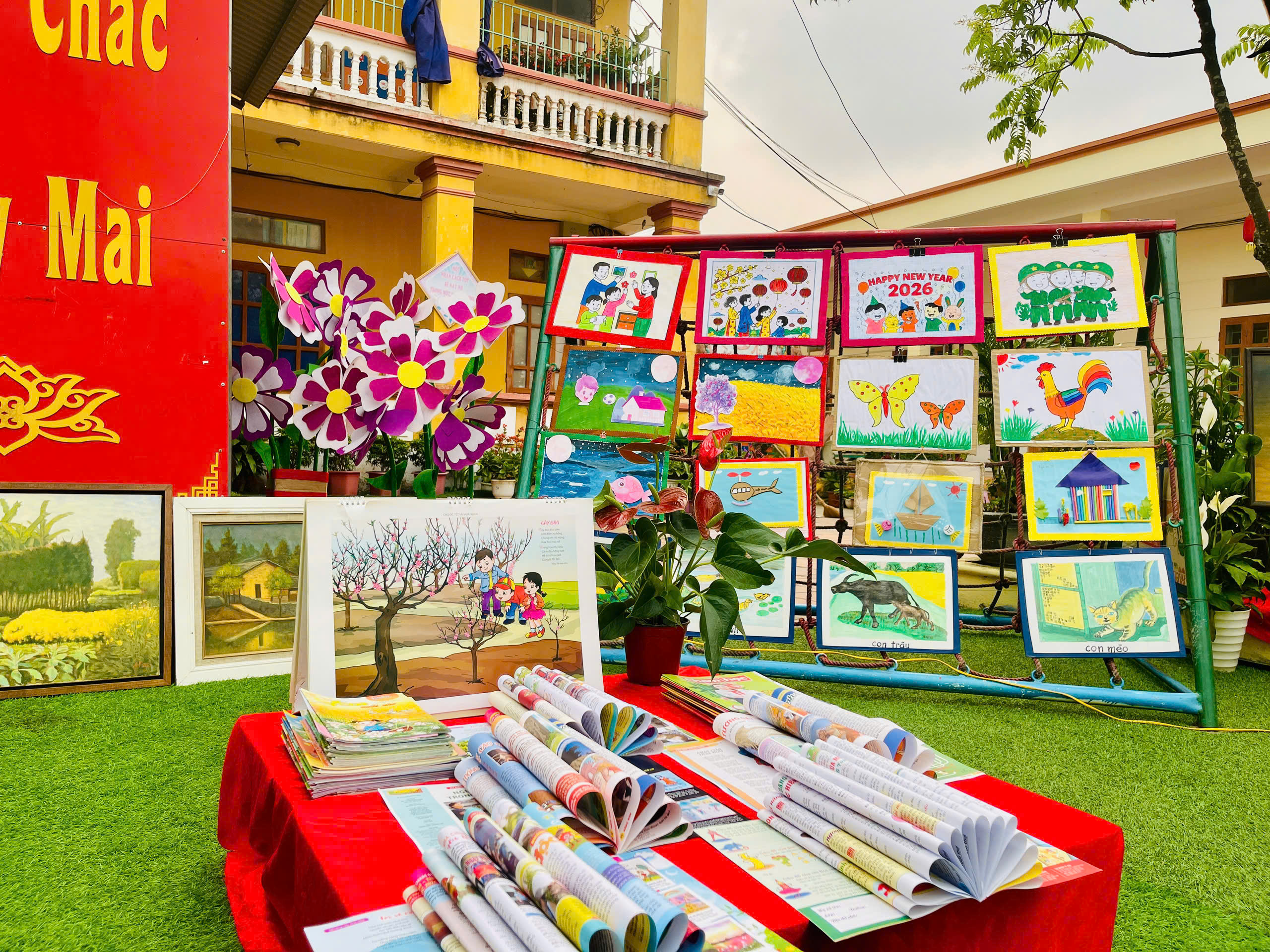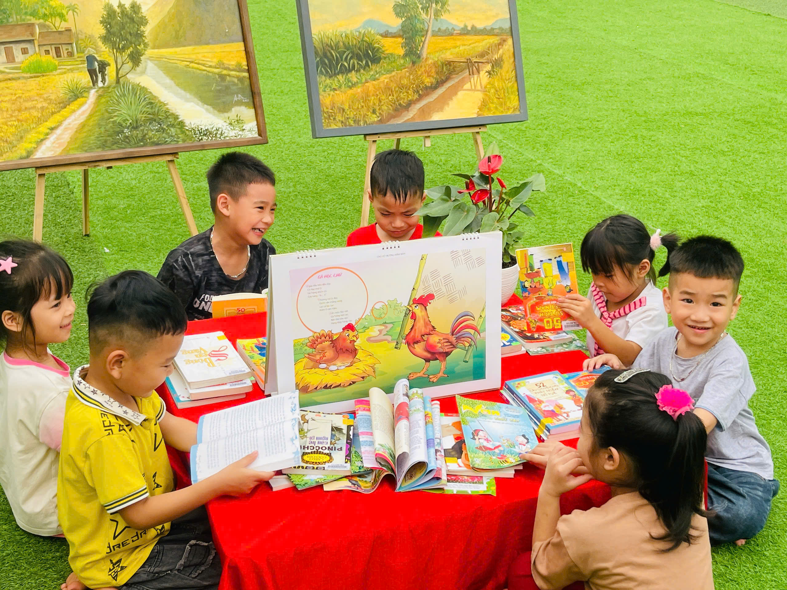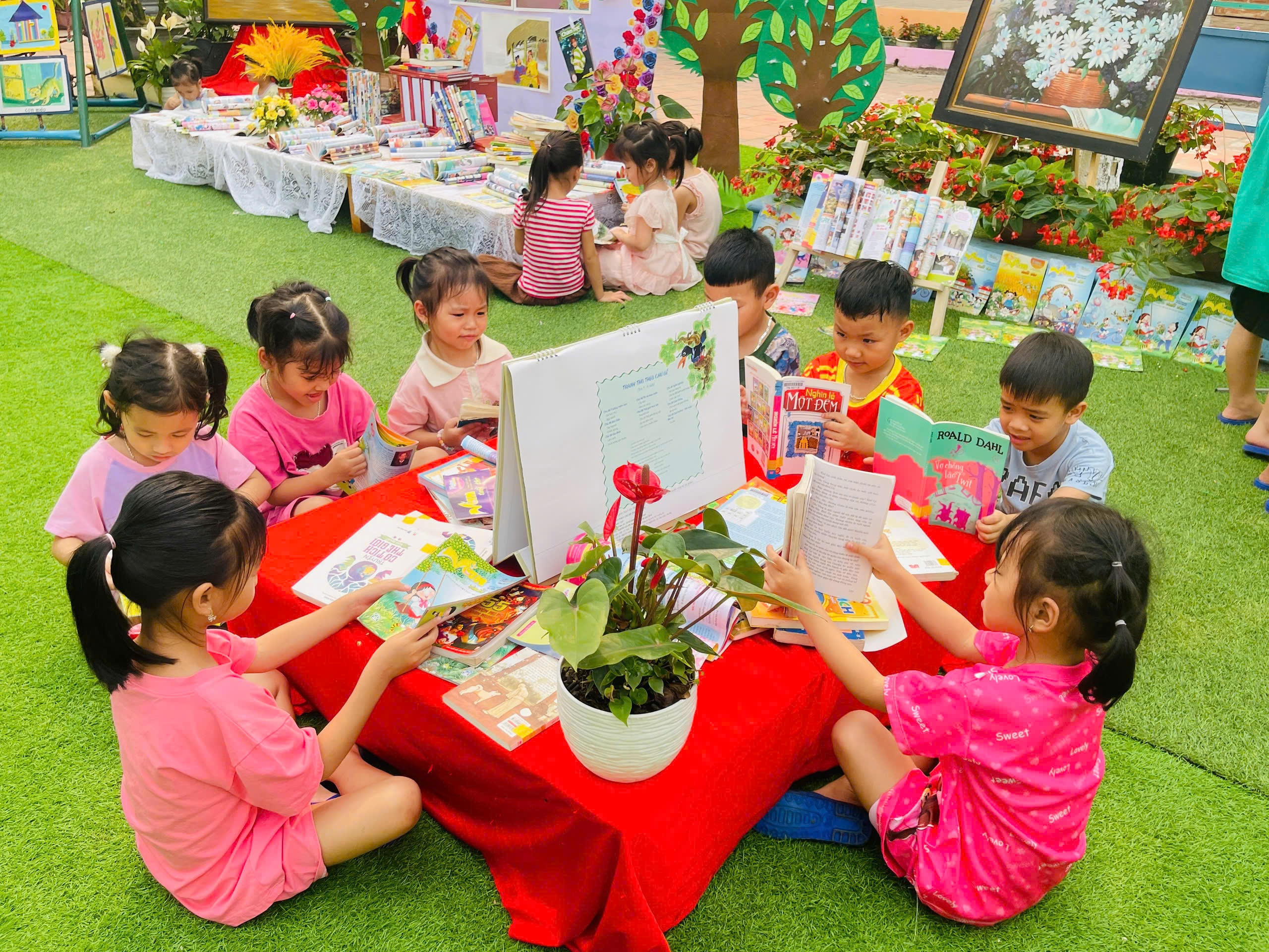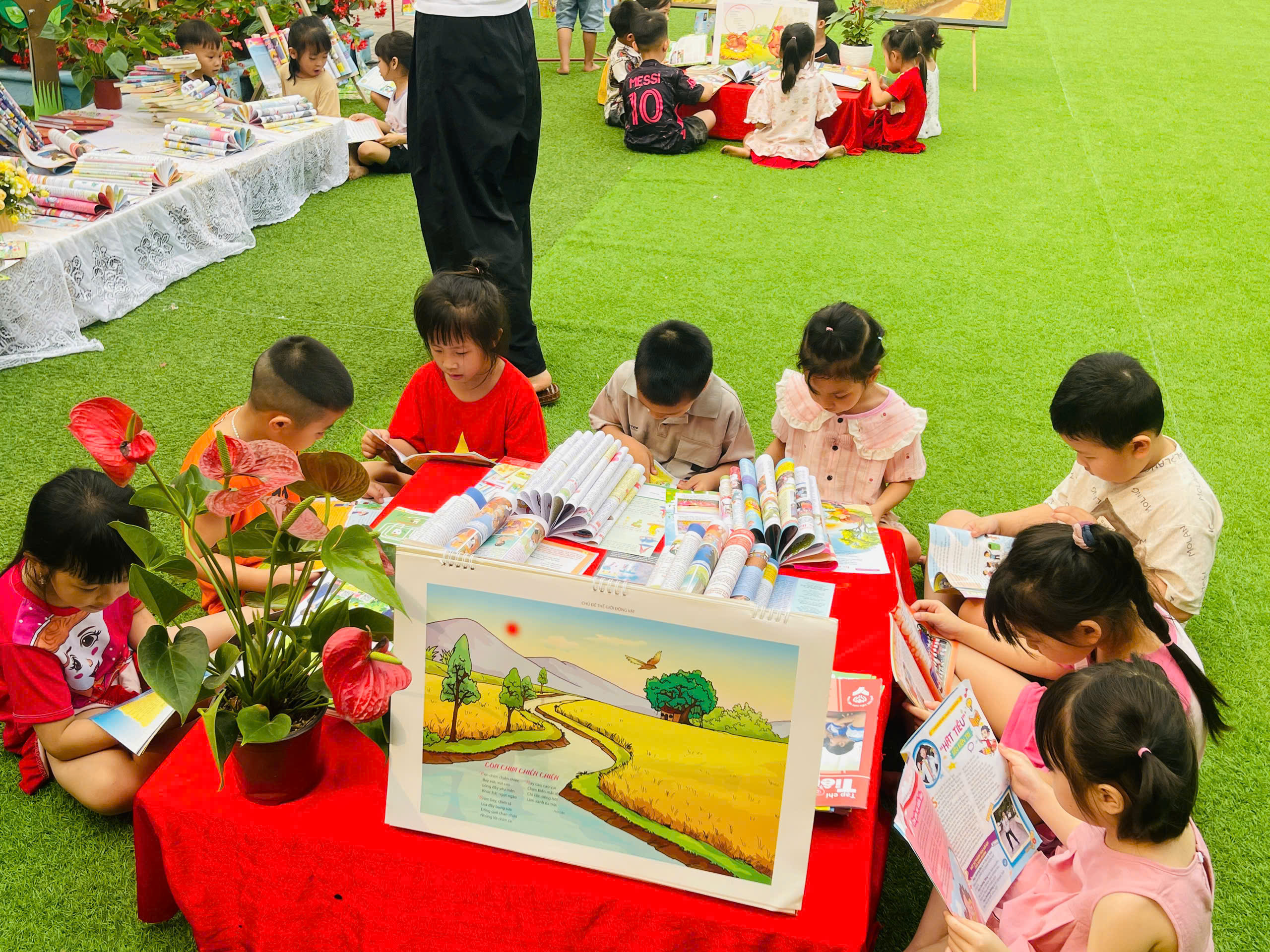 Những góc trưng bày được thiết kế sinh động với đa dạng các loại sách, truyện tranh phù hợp lứa tuổi mầm non. Đặc biệt, các sản phẩm do chính tay các bé và cô giáo cùng thực hiện đã tạo nên một không gian gần gũi, thân thiện và đầy sáng tạo.