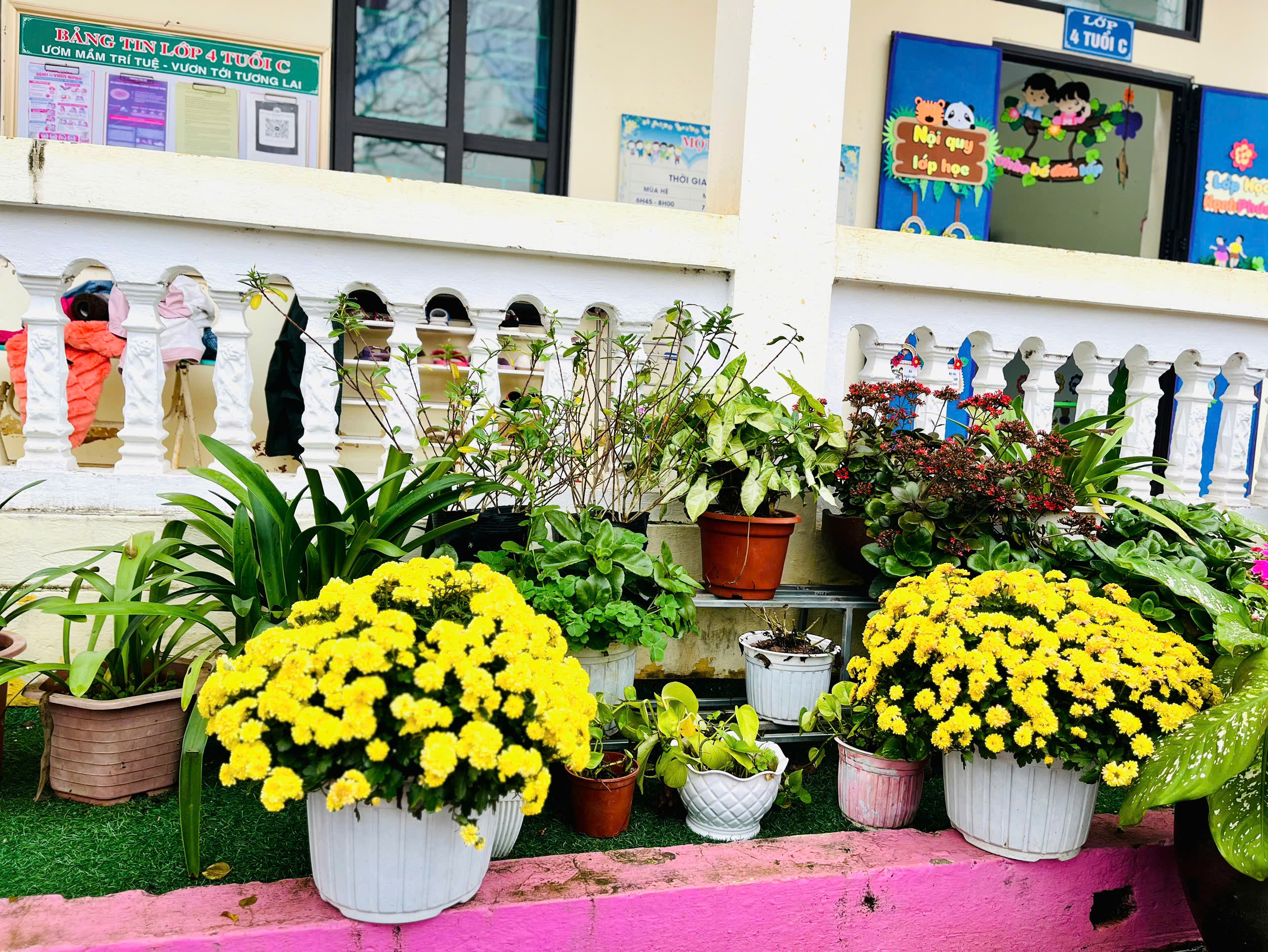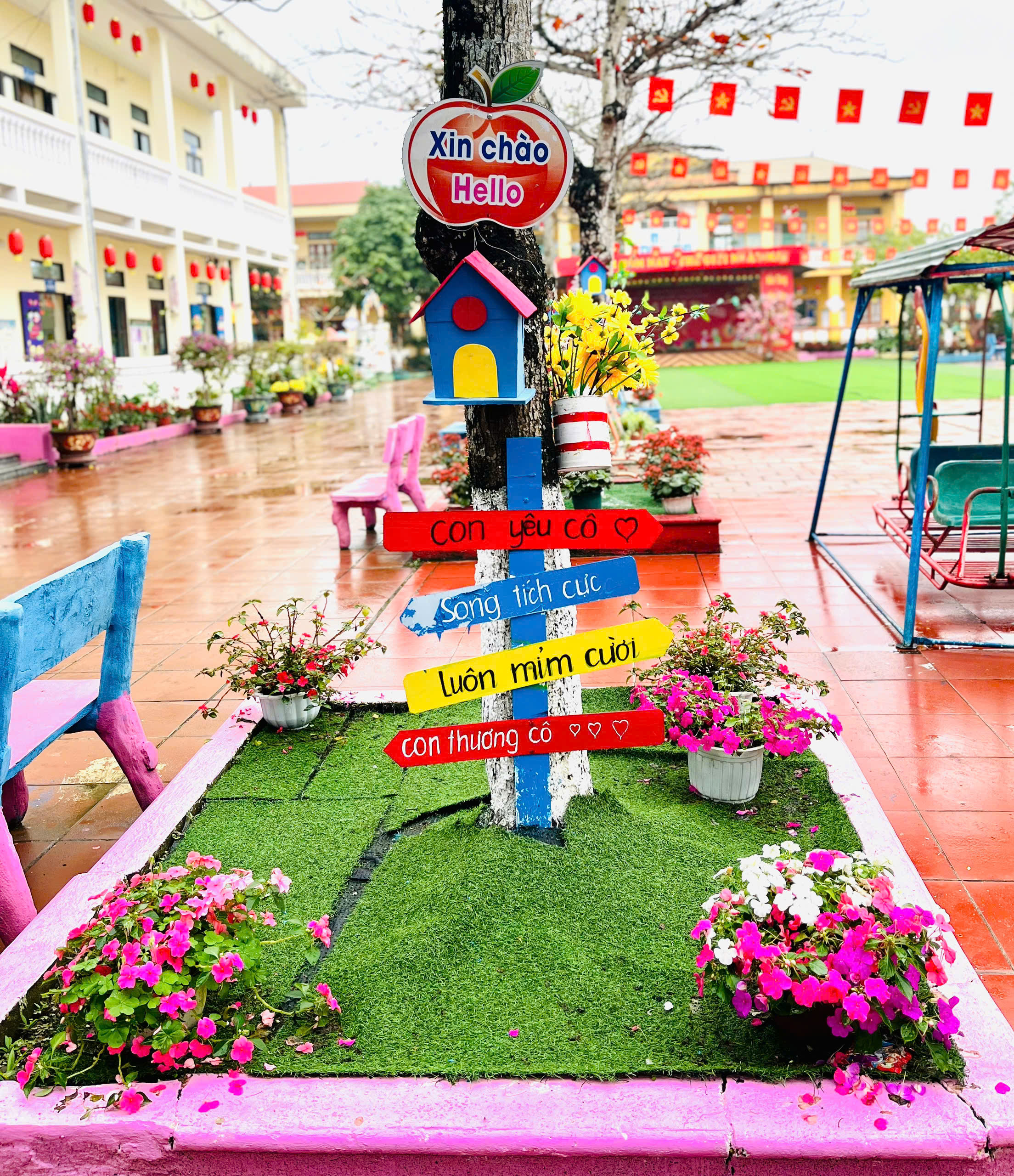 Sân chơi được sắp xếp gọn gàng, các khu vực vận động đảm bảo an toàn, khô ráo, sẵn sàng cho những tiếng cười rộn rã. Những bồn hoa, góc cây xanh được cắt tỉa, chăm sóc cẩn thận như lời chào xuân ấm áp gửi đến mỗi gia đình.