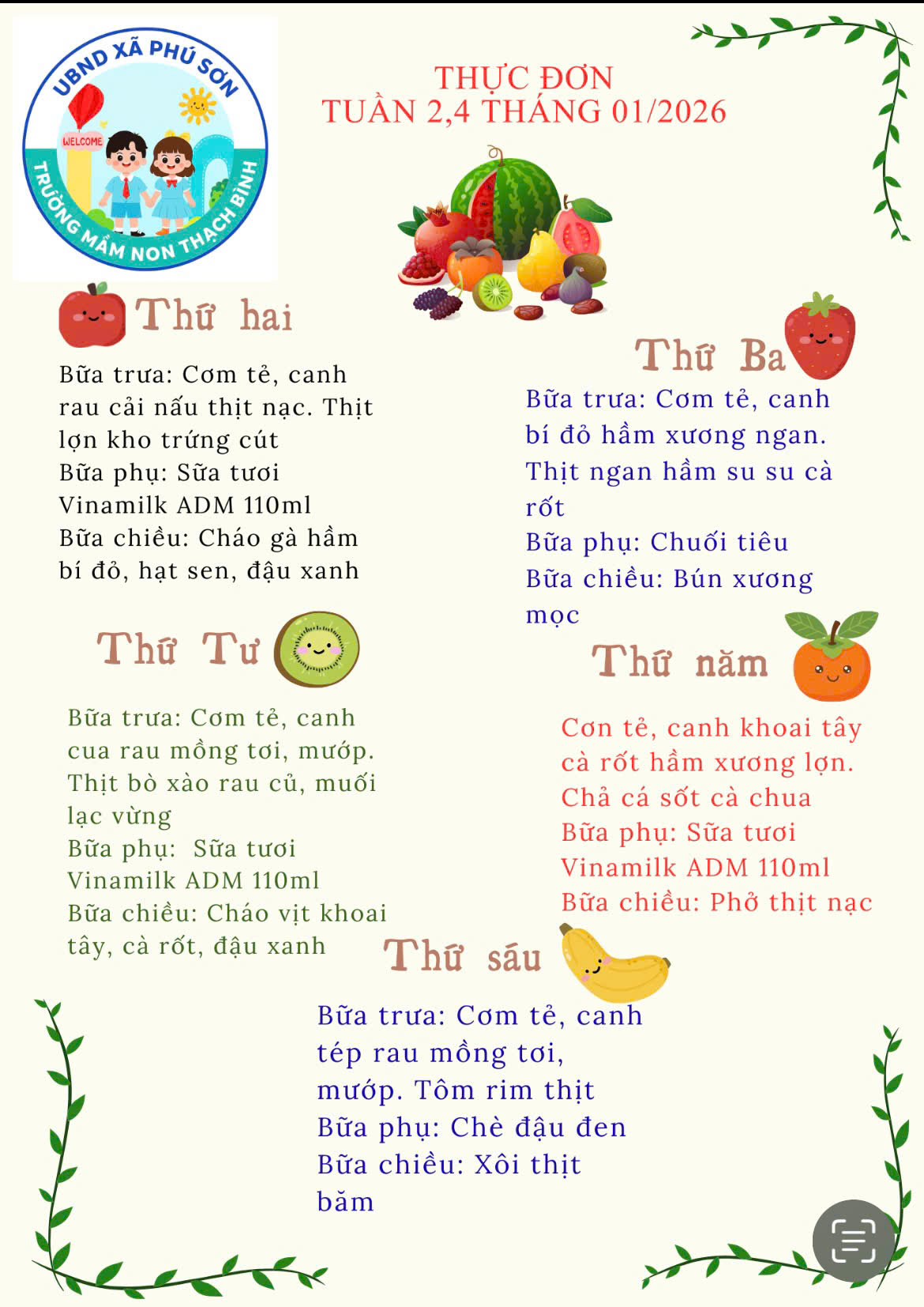 Thực đơn tháng 01 năm 2026 Trường Mầm non Thạch Bình